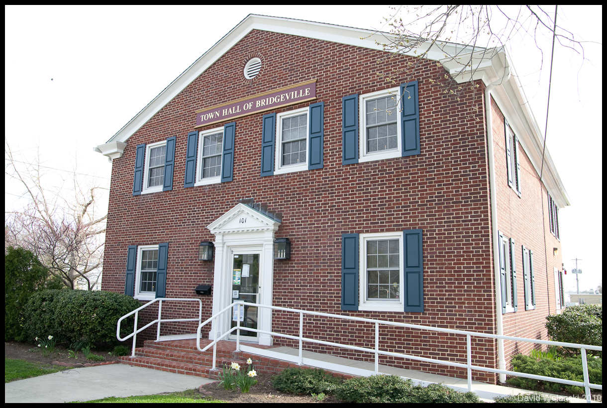 The Delmar town office. Delmar is a town on the border between Delaware and Maryland, at the bottom of the state.