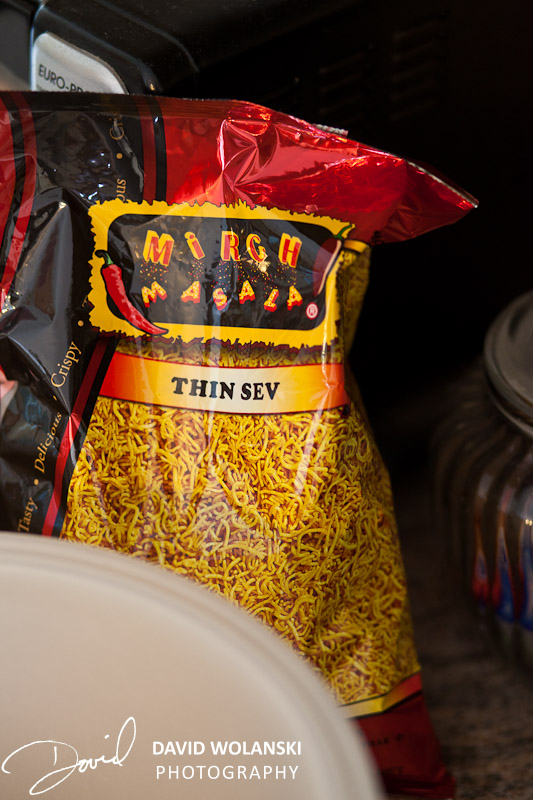 When it’s good and mixed, garnish the top with Thin Sev and Cilantro