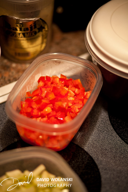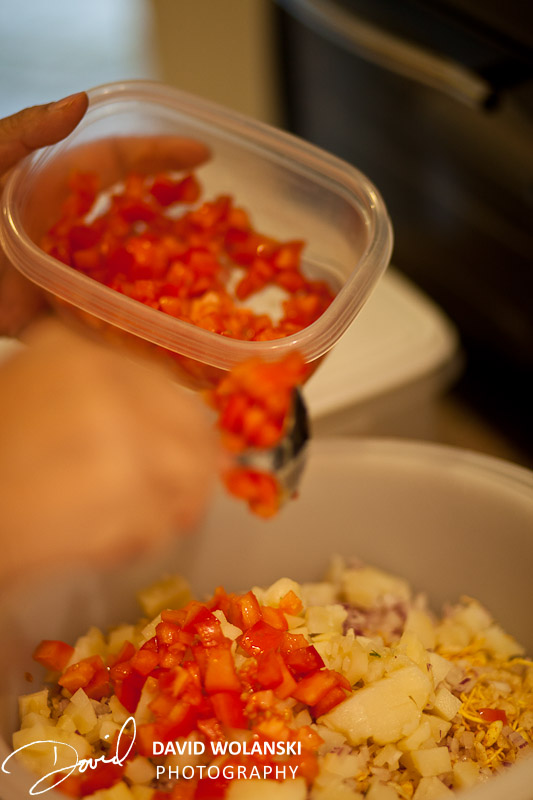 Shoot, I missed the potatoes! Boil some potatoes, chop them up in to cubes about the size of the apples and tomatoes.