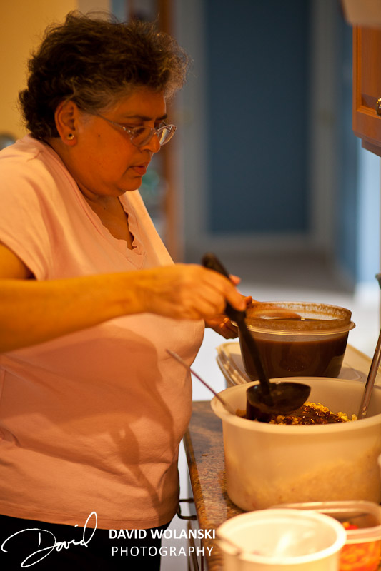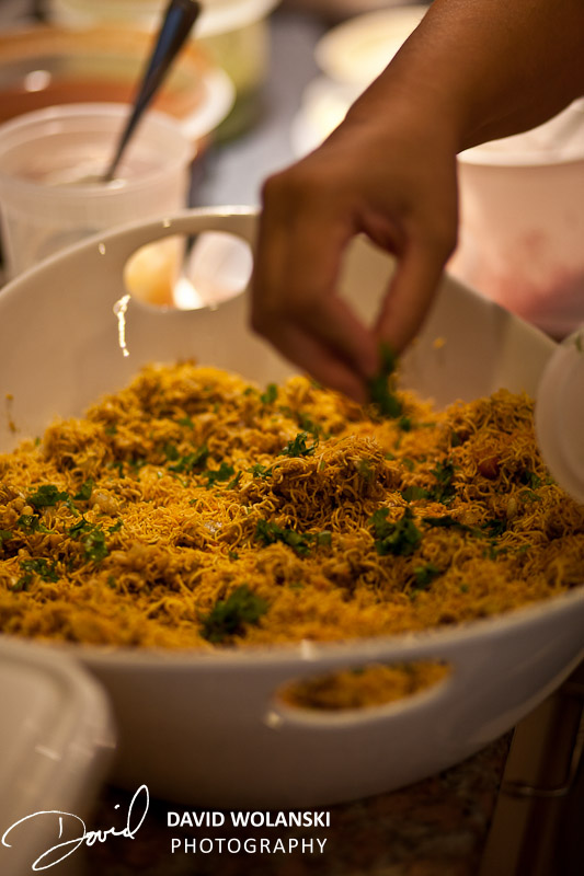 You saw how much was in the bowls. Use about half of each (except the chutneys) and pour them into a good size mixing bowl with the Puffed rice mix. You’ve got enough tomatoes, apples, potatos and onion for 2 batches.