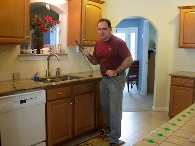 That piece of trim had to come out from under the granite over the sink. We laid out the tile on the island to make sure how it was going to look installed.