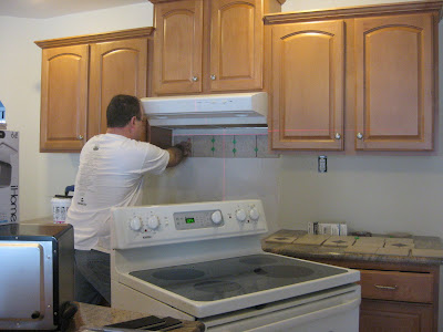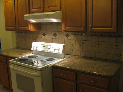 We spent the weekend putting up tile backsplash in the kitchen. It wasn’t so much hard as pains taking. We think it’s looking pretty good now. We got done doing the tiling today, and will do the grouting and stuff sometime this week. It’s going to look great when it’s grouted and caulked. (That’s an inside family joke).